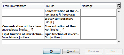 The window lists all potential inputs to the fish model. You should see two outputs of the invertebrate model being fed to the fish model - the lead concentration of invertebrate as well as a parameter you had not even thought about - the lipid content of invertebrates. Thank you MERLIN-Expo.