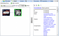 The information panel allows us to dive into the models and see what their internals look like. Click the Information button located to the right of your graph to reveal the panel. Next click the Fish sub-system. The information panel will now list all the components of the sub-system and you can click each of these items for an explanation. The very first part lists the inputs and outputs for fish. Among the inputs, you will find an input with the long name Concentration of the chemical in invertebrate caught for human food.