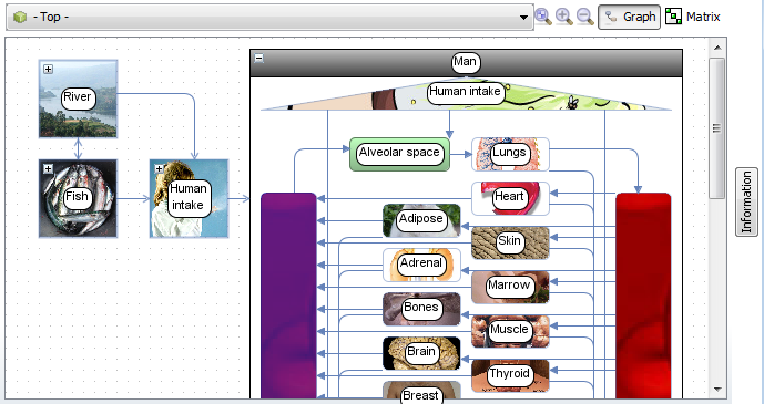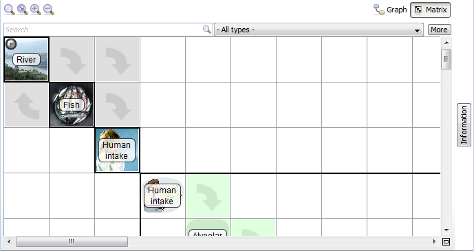 Graph buttons. The matrix arranges the sub-systems in the diagonal of a matrix with interactions displayed counter clock-wise in the off-diagonal elements. The graph shows the sub-systems as boxes connected with arrows.