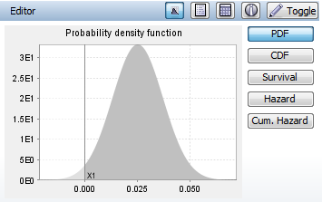 The familiar bell shape of the normal distribution is displayed in the editor. The buttons on the left allow you to change the graph to, instead of the PDF, show the CDF, survival function, hazard function or cumulative hazard function.